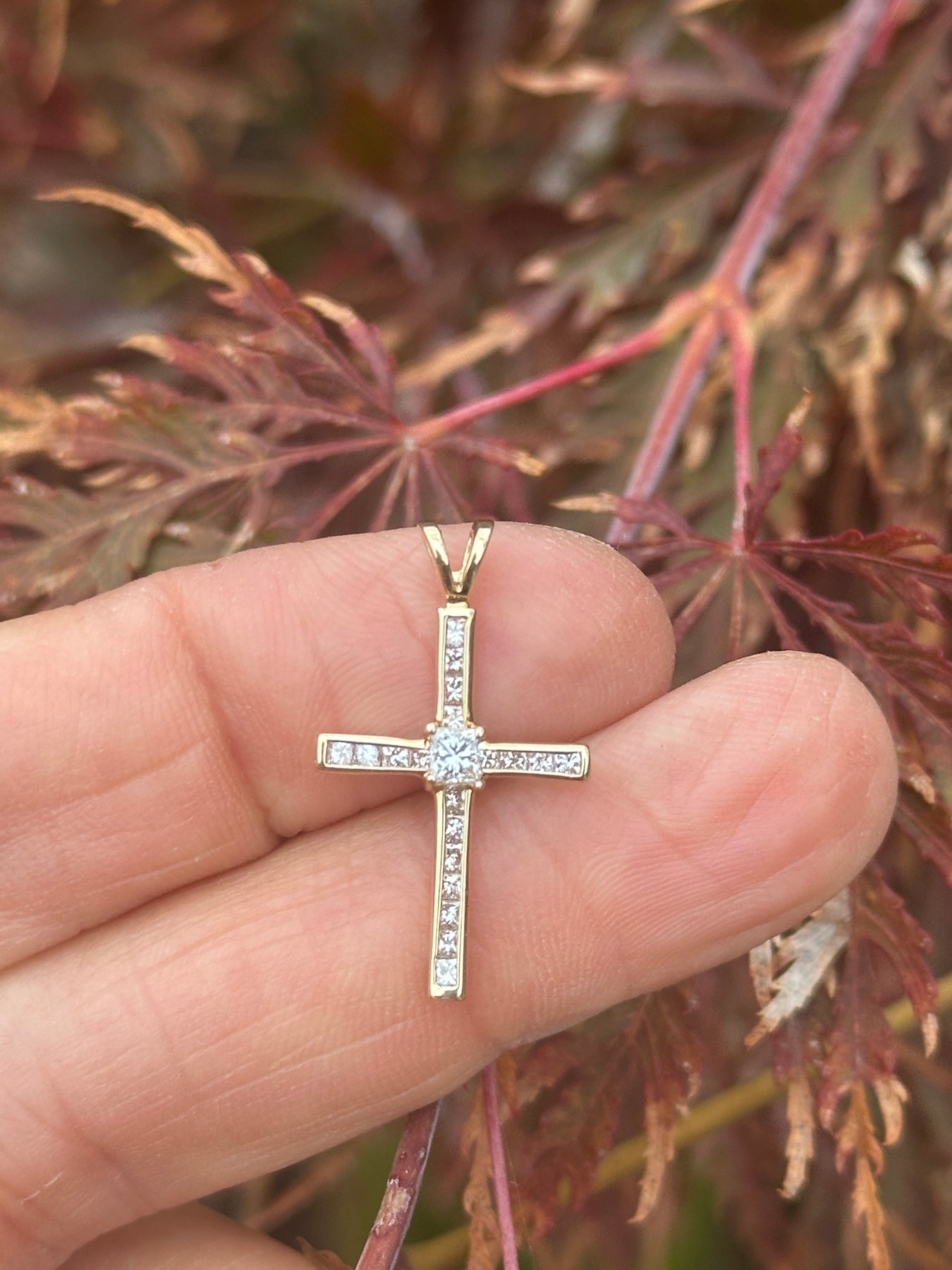 This 14K yellow gold cross pendant features a .95ct princess cut diamond channel set with superior VS clarity and G color. With its one larger centered diamond and classic design, this pendant is perfect for those seeking elegance and quality. Measures 1-1/2" in length.