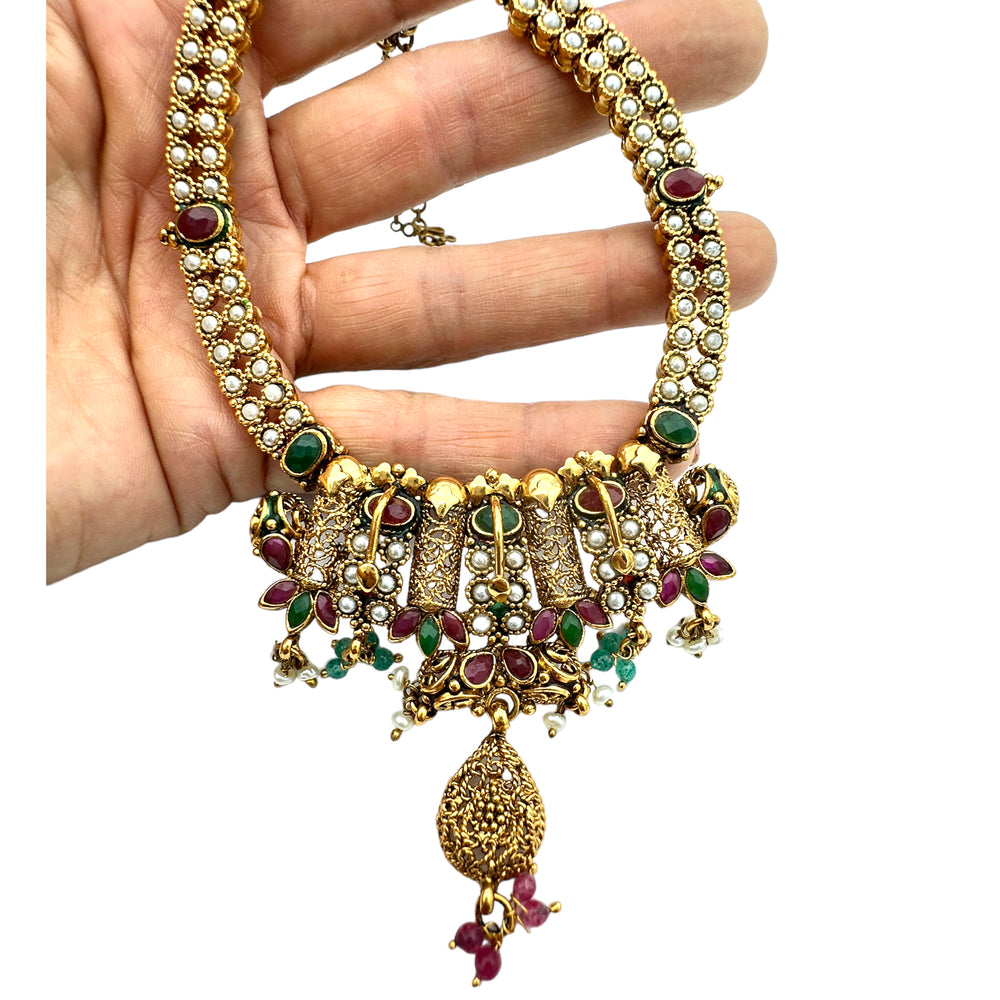 Cleopatra, jeweled necklace ornate in handmade scrolling and colored green and red stones. The pendant is adjustable for length at 16" and can be reduced for a choker. The 3-inch wide pattern consists of a dangle with beading that extends 2.75" long. A combination of red, green, and white pearls are intricately set in bezels or dangling as beads. Pearls are grouped and dangled along with green and pink colored beads.