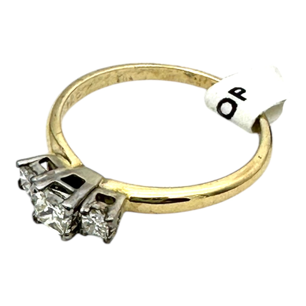 14 karat yellow gold, three stone princess diamond green .65 carat