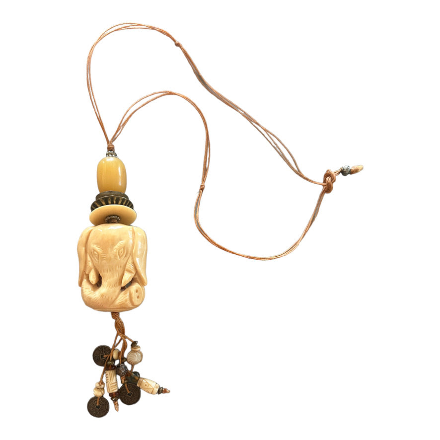 Carved elephant netsuke is 34" long necklace with beads on a cord
