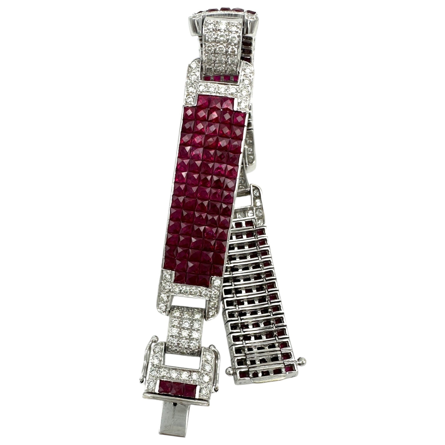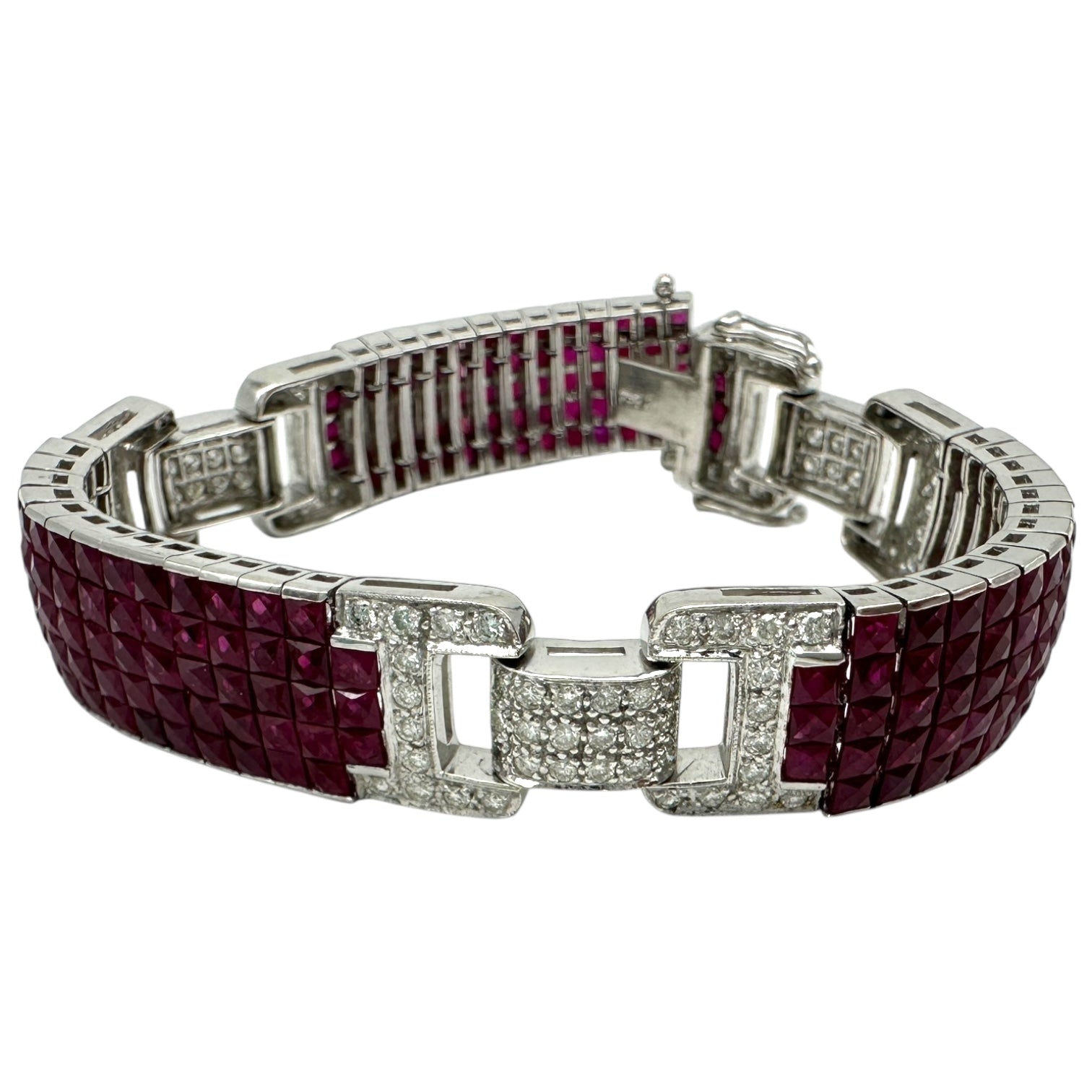 Invisible diamond & princess ruby bracelet of Burma precious gemstones. Length of bracelet is 7" Width is 13.30mm. Height is 4.27 mm Clasp contains two security latches and is a tongue-push component Rubies (47) rows of princess cut rubies. Ruby stones are a cut called Rose or French which means the faceting of the stones is on the table of stone. All facets are cut to magnify sparkle! Color: these are high-quality Burmese Rubies. Pigeon-blood colored Rubies The estimated weight is 10 Carats Diamonds 117 round brilliant diamonds set in a pave style setting of the links Weight is estimated at 1.00 carat Quality is SI1-VS2 clarity Color is H The total gem weight of the bracelet is 11.00 carats GIA Gemologist inspected and evaluated