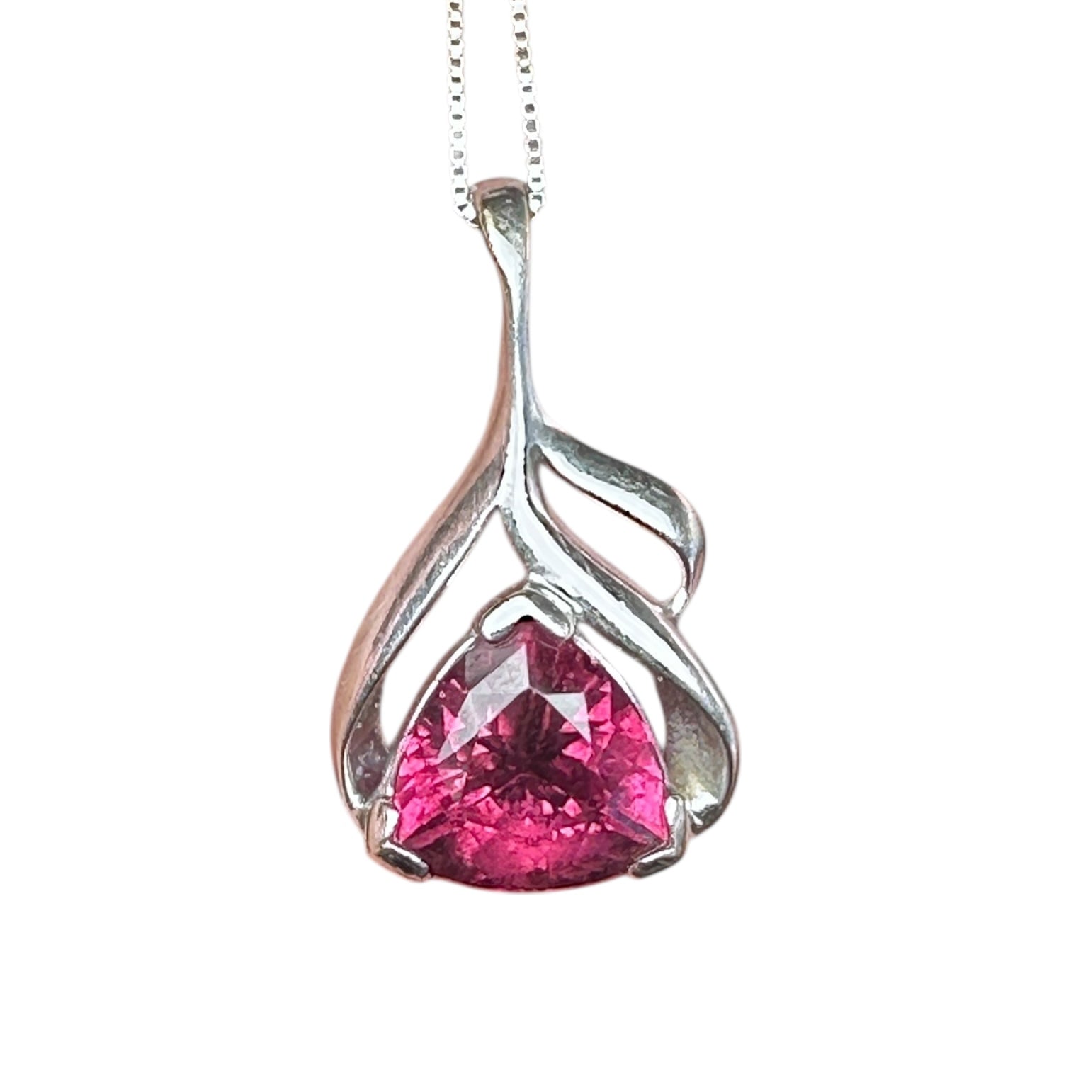 This 18-inch box-chain necklace showcases a striking 1-inch pendant featuring a 4.28-carat trillion-cut Tourmaline in deep burgundy and cherry red hues. The VS-quality stone measures 11mm x 6.70mm and displays exceptional brilliance as light dances across its faceted surface. The open metalwork design in 14kt pink gold maximizes the stone's visual impact, allowing its rich color to command attention. The generously sized pendant bail accommodates larger chain options for future customization, making this a versatile investment piece for the discerning collector.
