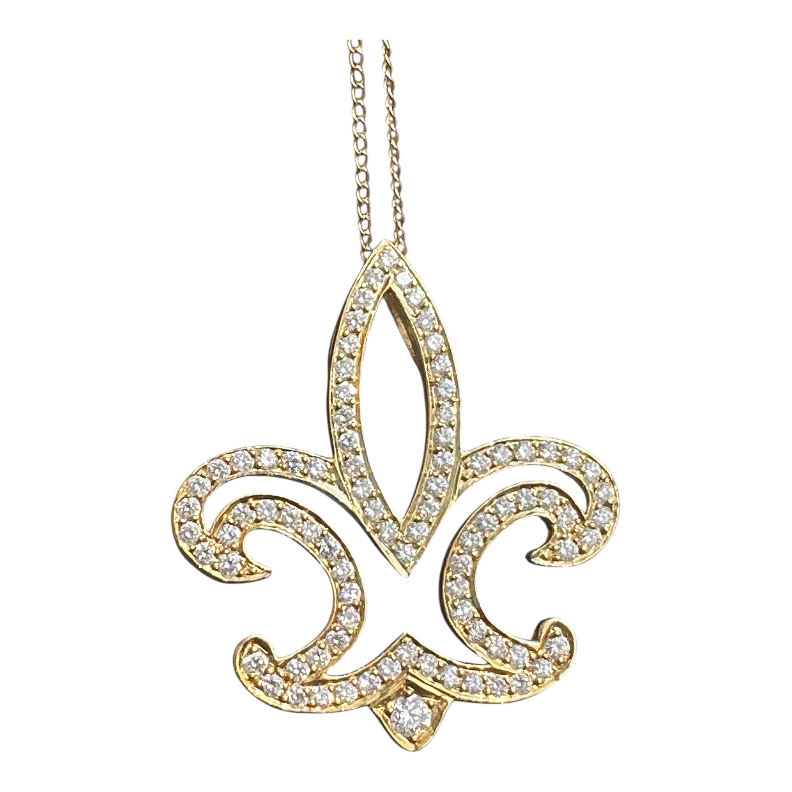 Beautiful Fleur De Lis Pendant consisting of pave set diamonds. The 14kt yellow gold pendant measures 1 inch in diameter with a heavy double bail for chains up to 5.5 mm in width.