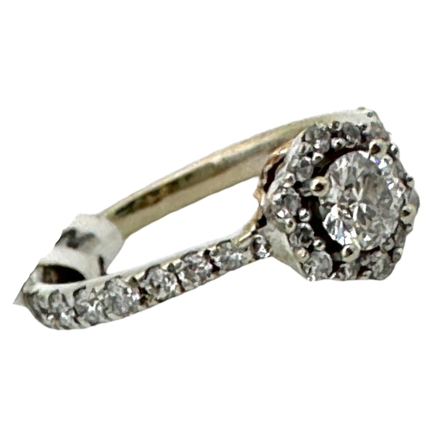 Beautiful Custom-made halo engagement ring is beautifully crafted with an under-cradle pink gold design. The ring measures a 7.30 mm halo and shank that graduates 2 mm from the top to bottom of ring. The height of the halo is 6.03 mm The ring features a center 4.30 mm round brilliant cut diamond measuring .34 carat set in a octagon-styled, halo setting. The quality of the diamond is SI2 clarity and H color. The setting consists of (28) round brilliant cut diamonds surrounding the center and sides of the ring. The total of these diamonds average .35 carat. Quality are SI1 clarity and H color Total rings, diamond weight is .69 carat. Ring size is 4.5 Weight of gold is 1.95 grams.