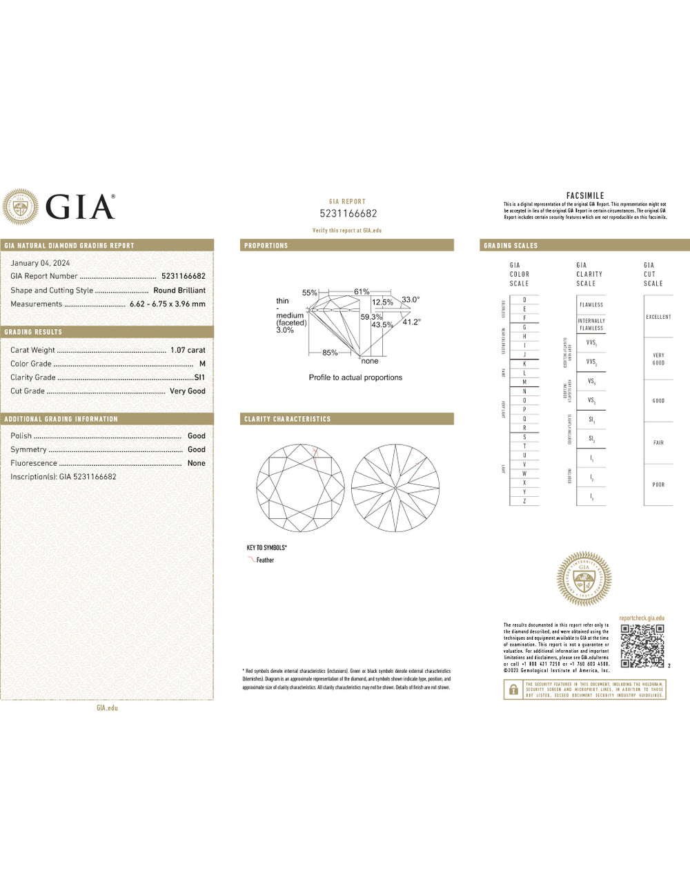 14Kt Engagement Diamond Ring GIA Certified 1.07 Carat Round SI1-M