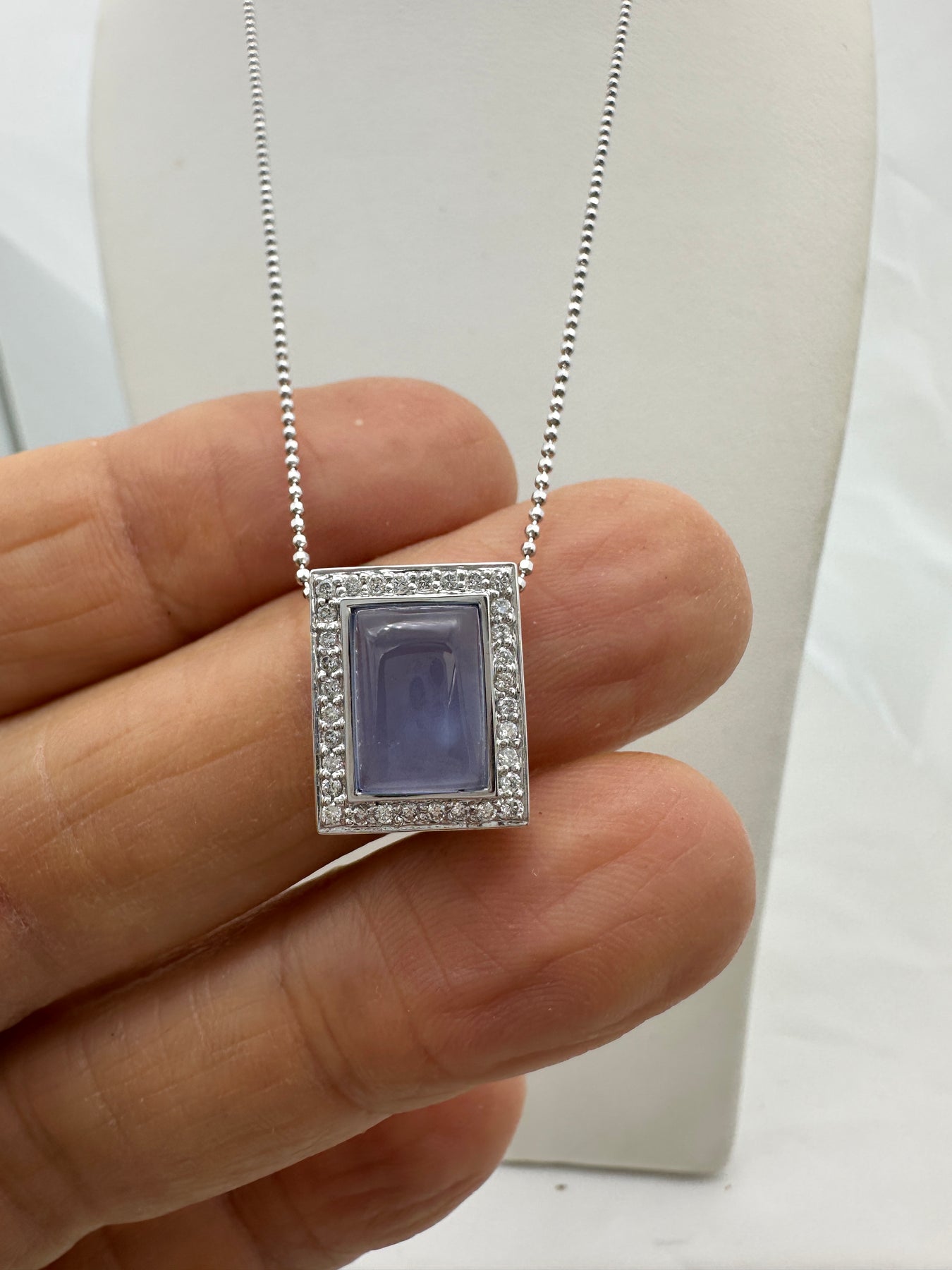 18 karat Chalcedony Gemstone and Diamond Halo Pendant With Chain