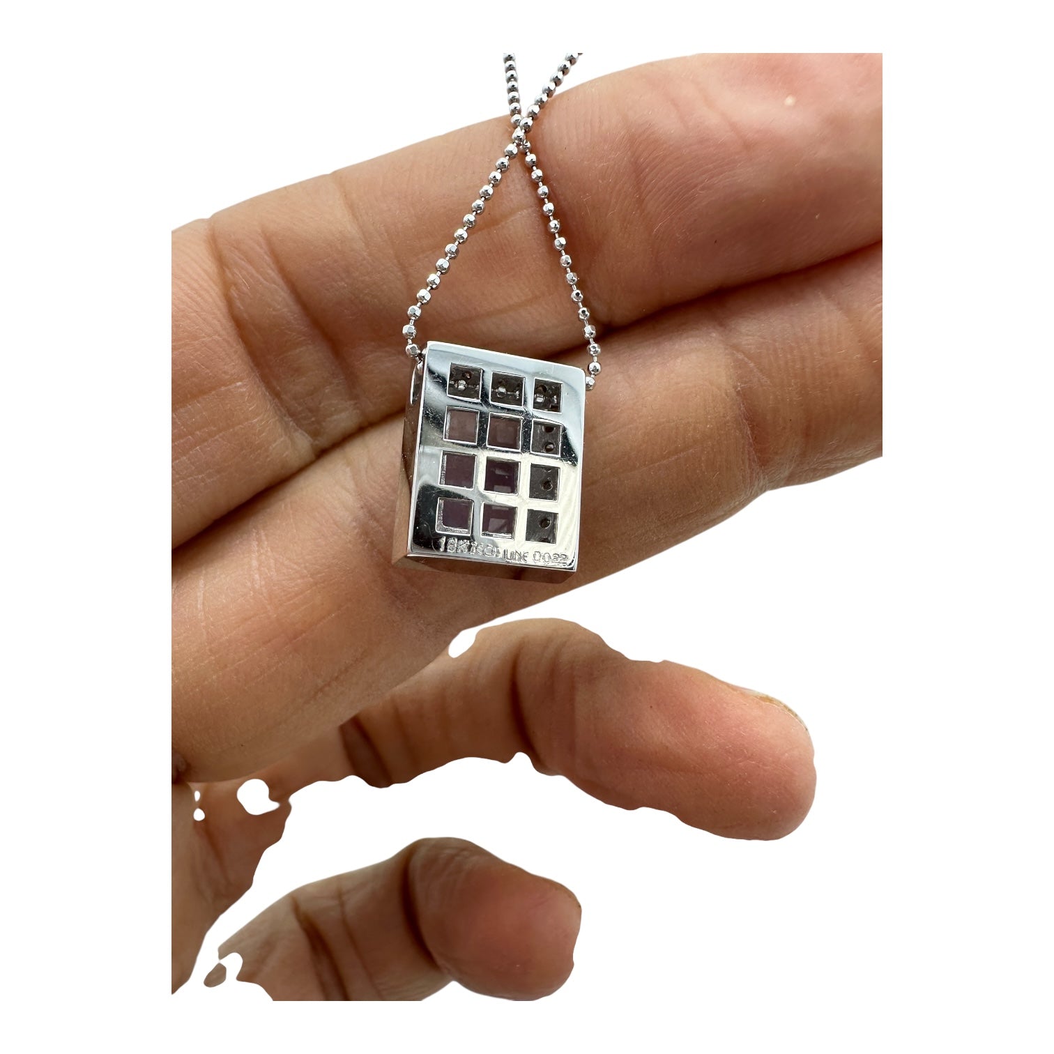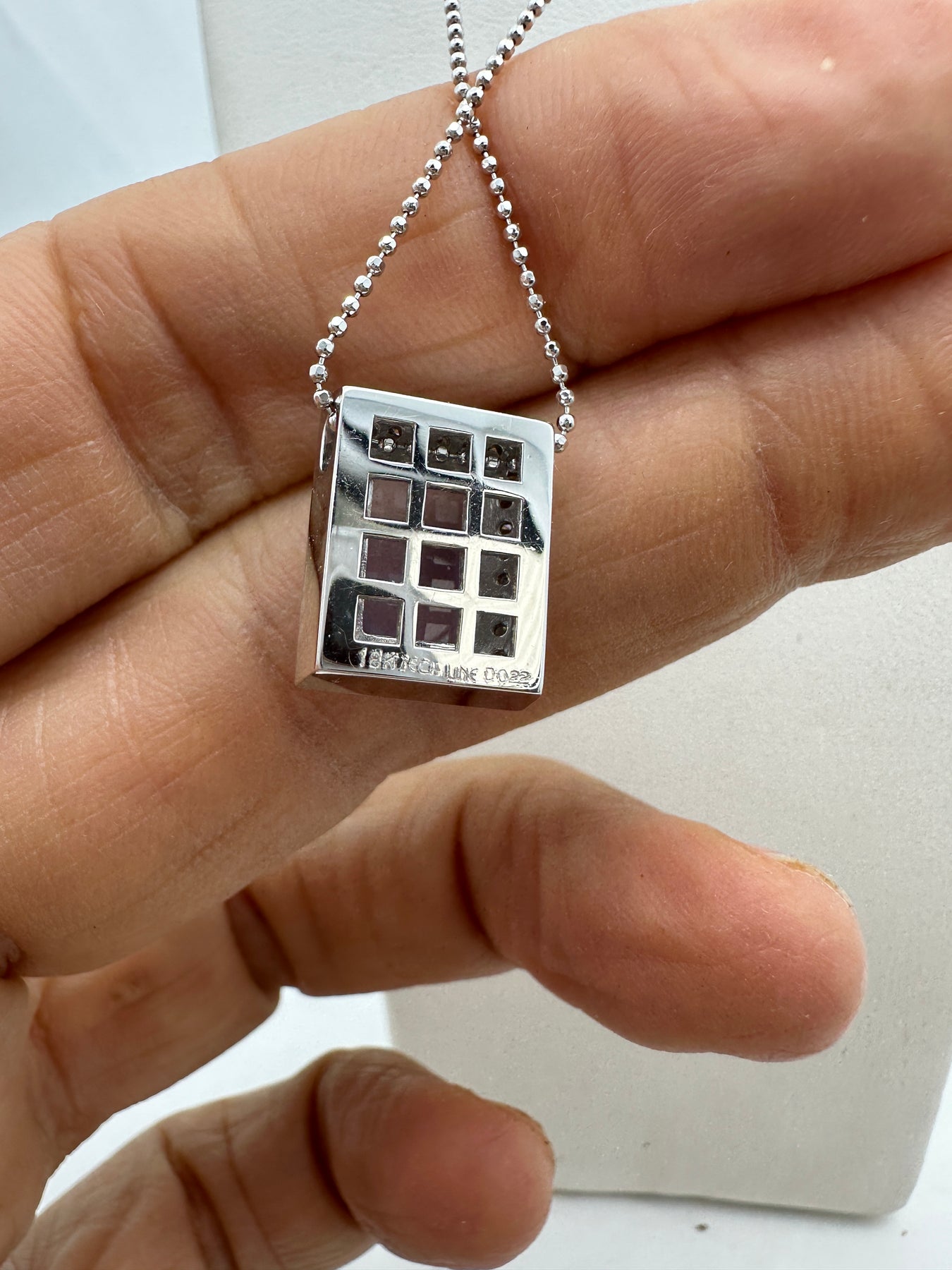 This stunning pendant features a rectangular shaped Chalcedony and diamond halo, measuring 14.20 x 12 mm. The total diamond weight is .22 carats, with VS clarity and G color. The 18 karat gold with chalcedony gemstone adds a touch of luxury, while the Pendant is suspended by an 18 inch diamond cut ball chain, that slides. Available in size 8.