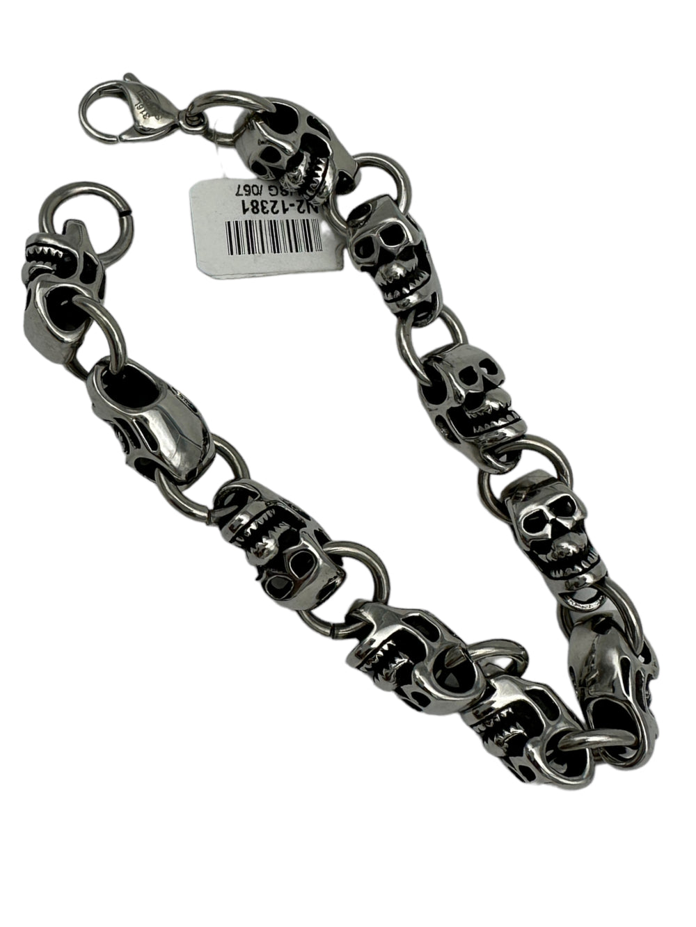 8-1/6" length skeleton, skull bracelet is silver colored with black highlights.