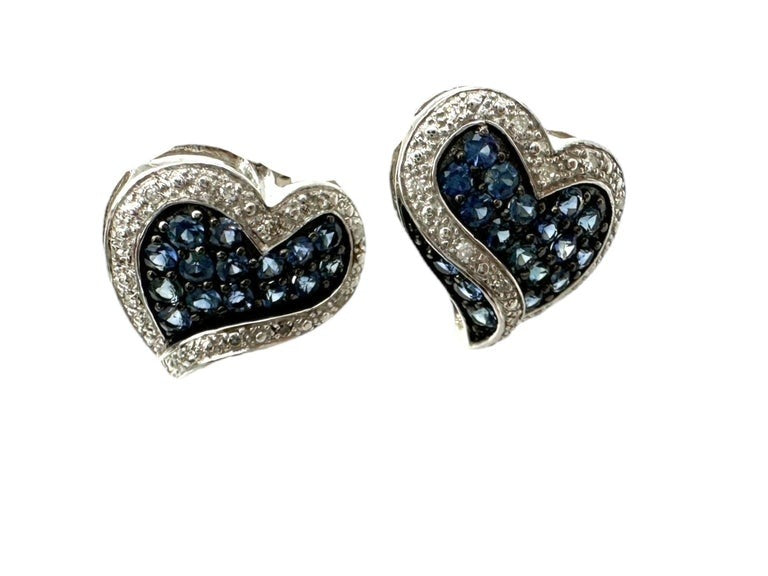 As a product expert, I highly recommend these elegant 1.80 Carat Blue Sapphire and Diamond Heart Earrings in White Gold. The pave setting of sapphires and diamonds in a puffy, concave design adds a stunning touch. Measuring 13mm in diameter, these stud earrings are sure to catch attention.