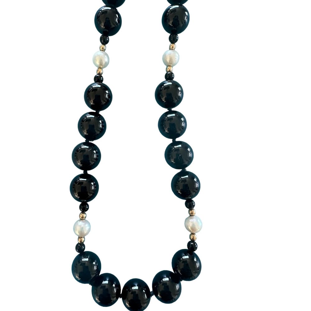 Experience luxury with our 14 karat black and white bead pearl necklace. Featuring a jumbo 12.5 mm black onyx and 7 mm pearls, this custom-made 16 inch necklace exudes elegance and sophistication. Elevate your style and make a statement with this stunning addition to your jewelry collection.