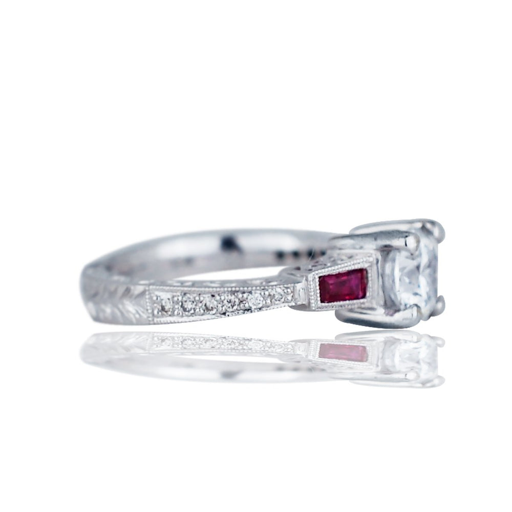 14 Kt White Gold Ruby and Diamond Engagement Ring Setting, With Filigree Milgrain Etching