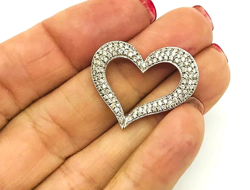 This 14K white gold heart pendant sparkles with 1 carat of diamonds in an open pave setting, providing a dazzling and eye-catching piece of jewelry. The expert craftsmanship and timeless design make this an elegant and beautiful addition to any jewelry collection.