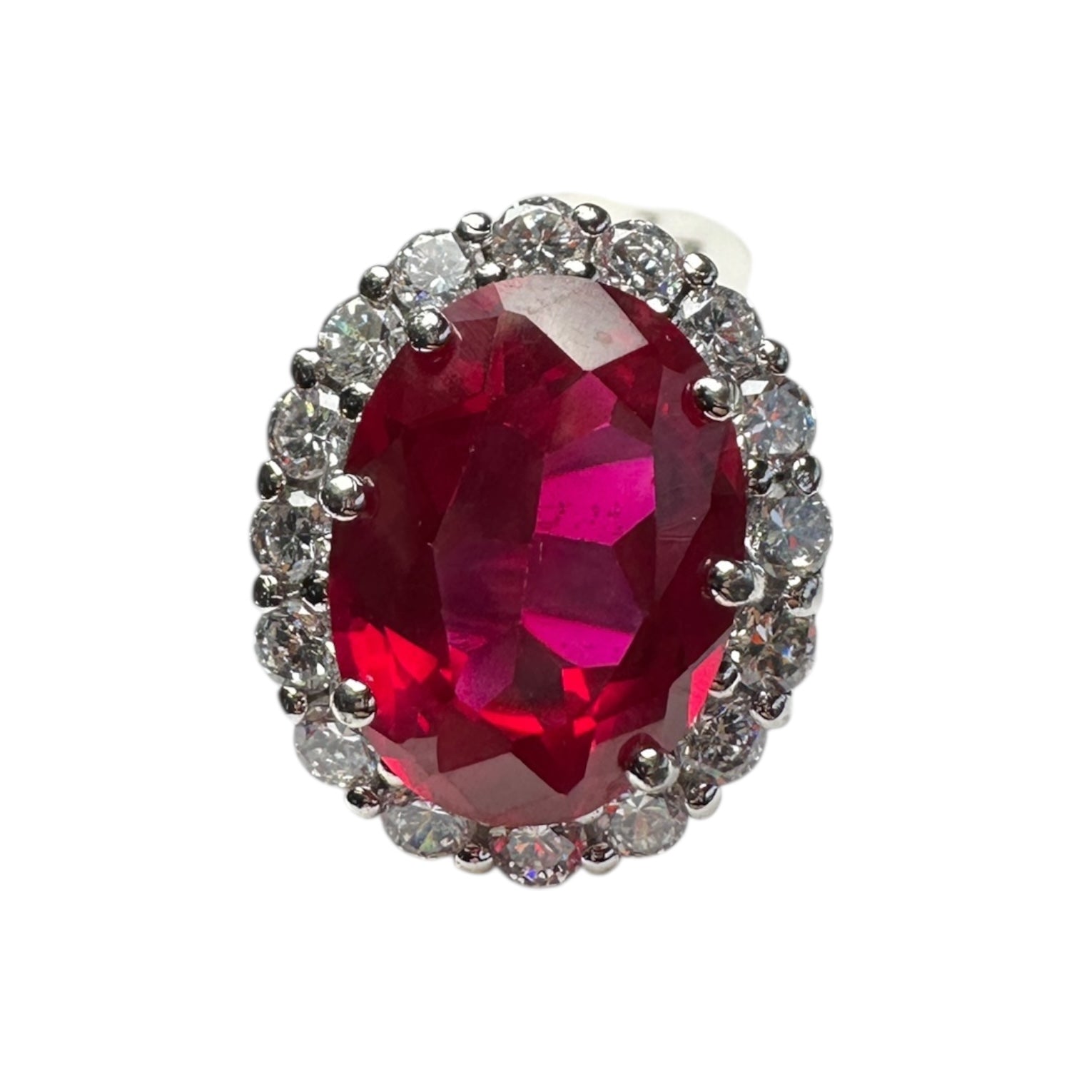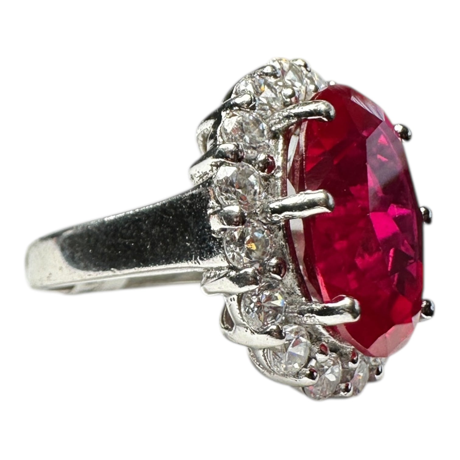 Elevate your travel collection with this sophisticated platinum ring featuring a striking 5 carat oval red stone measuring 16 x 12.50 mm. The vibrant centerpiece is beautifully framed by prong-set cubic zirconia stones, weighing 2.00 carats, that catch the light from every angle. Crafted in durable platinum and sized at 6, this substantial piece combines elegance with practicality—perfect for those who refuse to compromise on style while on the move. The secure setting and premium metal ensure lasting brilliance through your adventures.