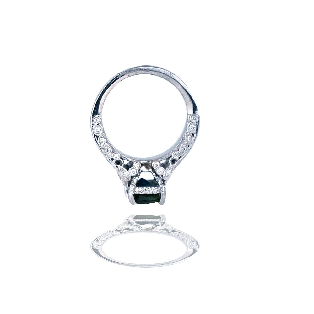 This Sapphire and Diamond Platinum Ring 3.54TCW is a stunning piece of jewelry featuring a pave three-sided diamond setting in platinum. With its classic design, it's sure to draw attention with its sapphire and diamonds. For timeless elegance and quality craftsmanship, this is the perfect ring.