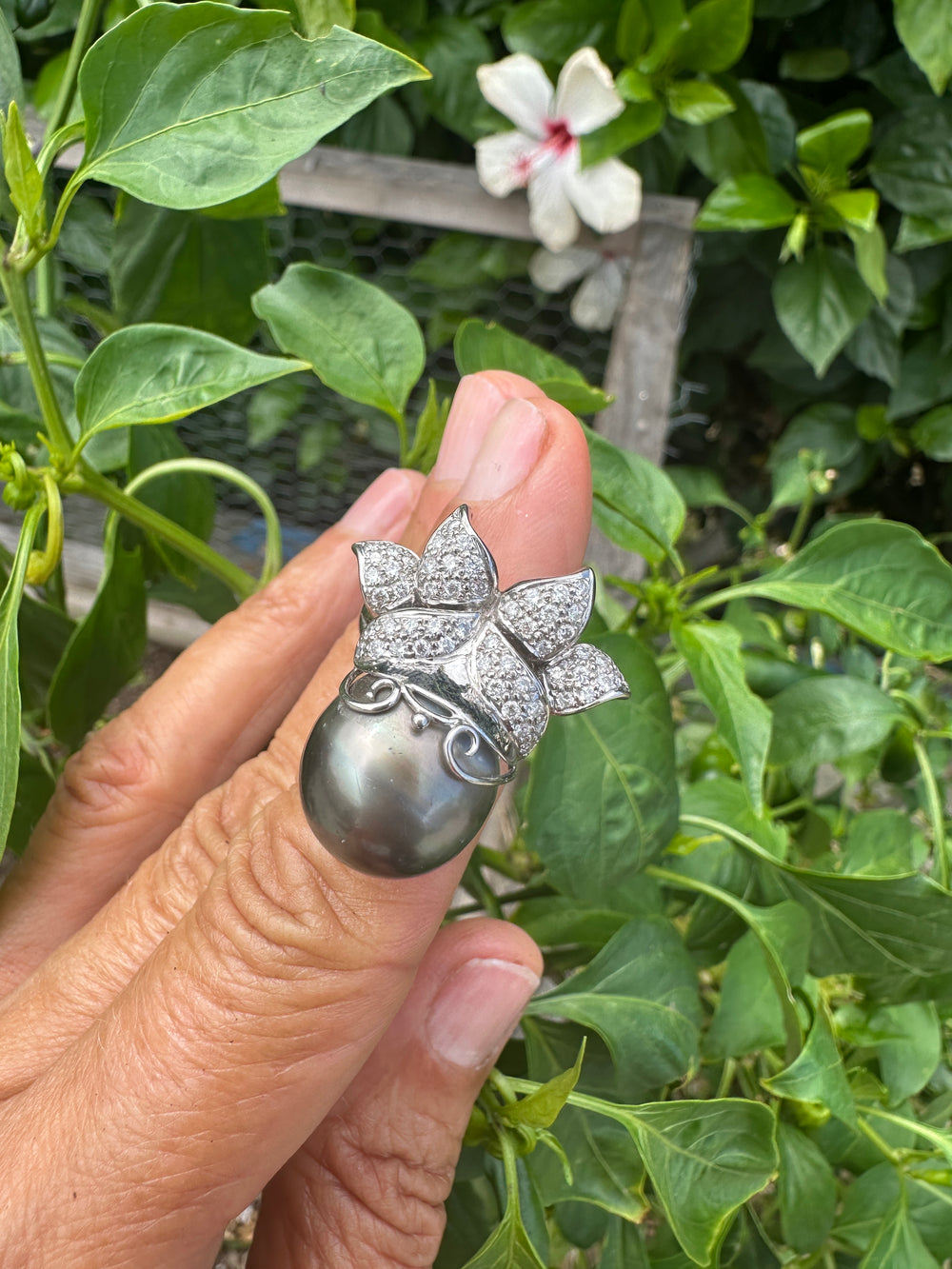 This AAA Diamond and Tahitian 14.11 MM Pearl Ring is a luxurious piece of jewelry. It features an elegant 1.50 carat gray Tahitian pearl and is accented with a flower motif, adding a touch of classic beauty to your look. A timeless choice, perfect for adding a hint of glamour to any outfit.