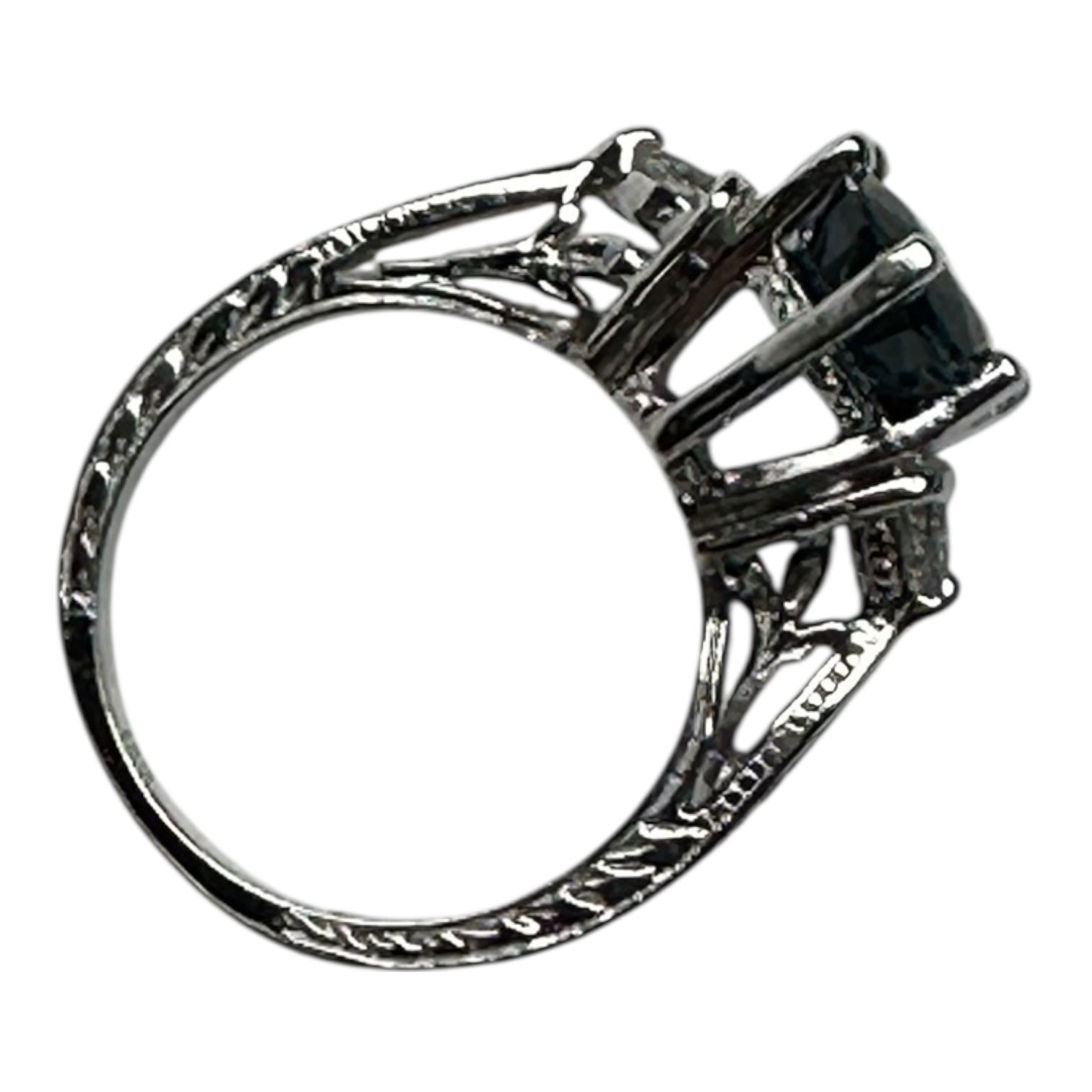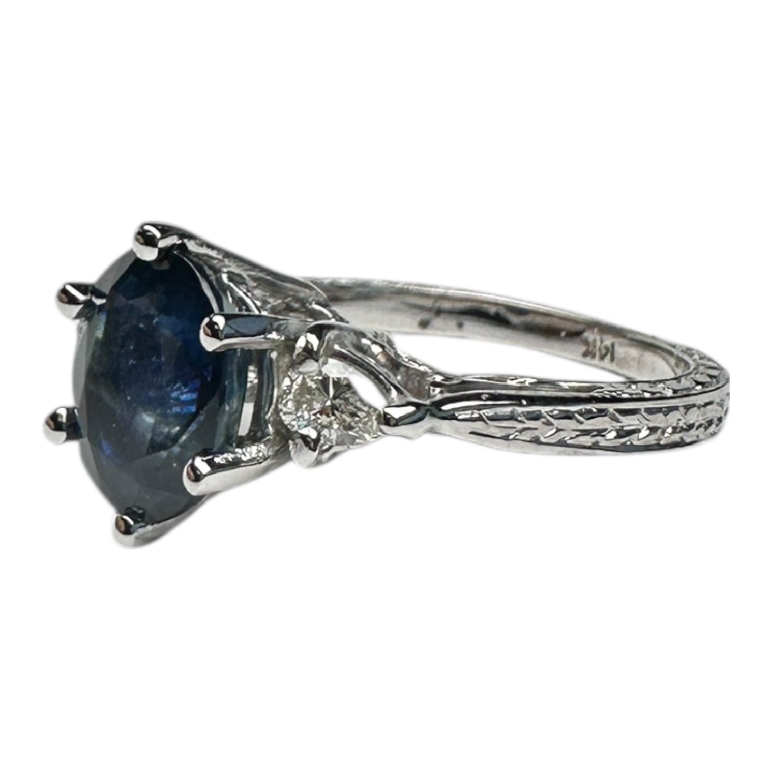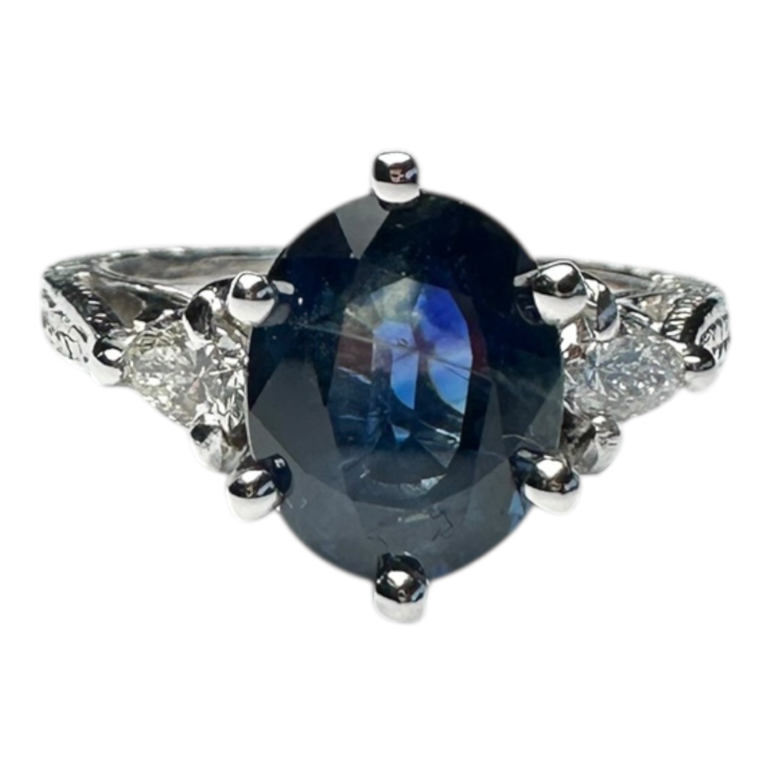 This elegant 14 karat ring showcases a stunning 3.55 carat natural oval sapphire with rich blue coloring and S12 clarity. The shank is etched beautifully and complemented by two pear-shaped diamond accents totaling 0.35 carats in VS clarity and G color. The sapphire measures 10 x 7.77 x 4.15 mm, creating a sophisticated three-stone design. Sized at 6.5, this piece combines the timeless appeal of sapphire with the brilliance of quality diamonds, making it an exceptional choice for those seeking refined gemstone jewelry with genuine investment value.